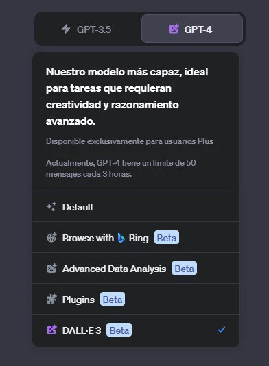 El acceso a Navegación, Análisis Avanzado de Datos y DALL-E es ahora automático. (Si lo prefiere, la selección manual sigue disponible en GPT-4)».
