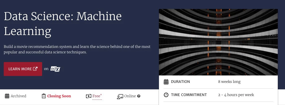 Este curso de ocho semanas de duración estima que será necesario destinar entre dos y cuatro horas a la semana (aunque es una orientación, pero puedes ir a tu ritmo) para aprender los principios del machine learning, cómo realizar validaciones cruzadas, algunos algoritmos más usados de machine learning, cómo construir el sistema de recomendación, entre otras. Atención si te interesa porque el curso se cerrará pronto.