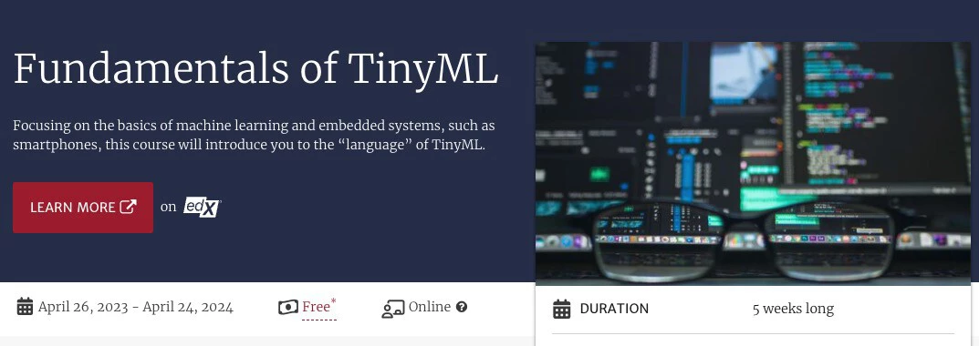 Este curso de cinco semanas de duración y un esfuerzo estimado de dos a cuatro horas semanales te enseñará los fundamentos de machine learning, deep learning y TinyML, cómo recopilar datos para el ML, cómo entrenar e implementar modelos, a comprender el ML integrado y a crear diseños responsables.