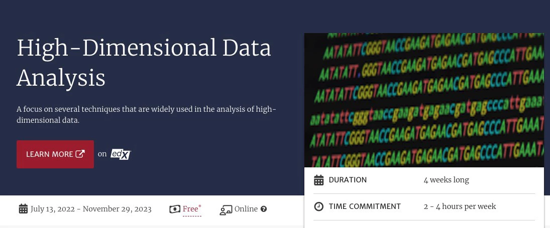 Este curso de cuatro semanas de duración y una dedicación estimada de dos a cuatro horas semanales tiene como meta enseñarte cosas como la distancia matemática, reducción de dimensiones, descomposición de valores singulares y análisis de componentes, gráficos de escala multidimensional, análisis factorial y trabajar con lotes y sus efectos. El curso se cierra a finales de noviembre de este año.