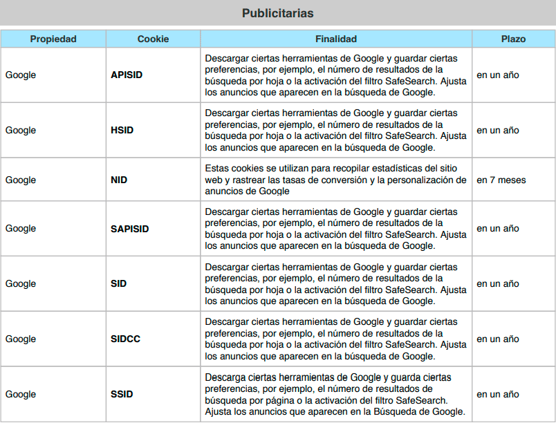 COOKIES UTILIZADAS EN ESTE SITIO WEB